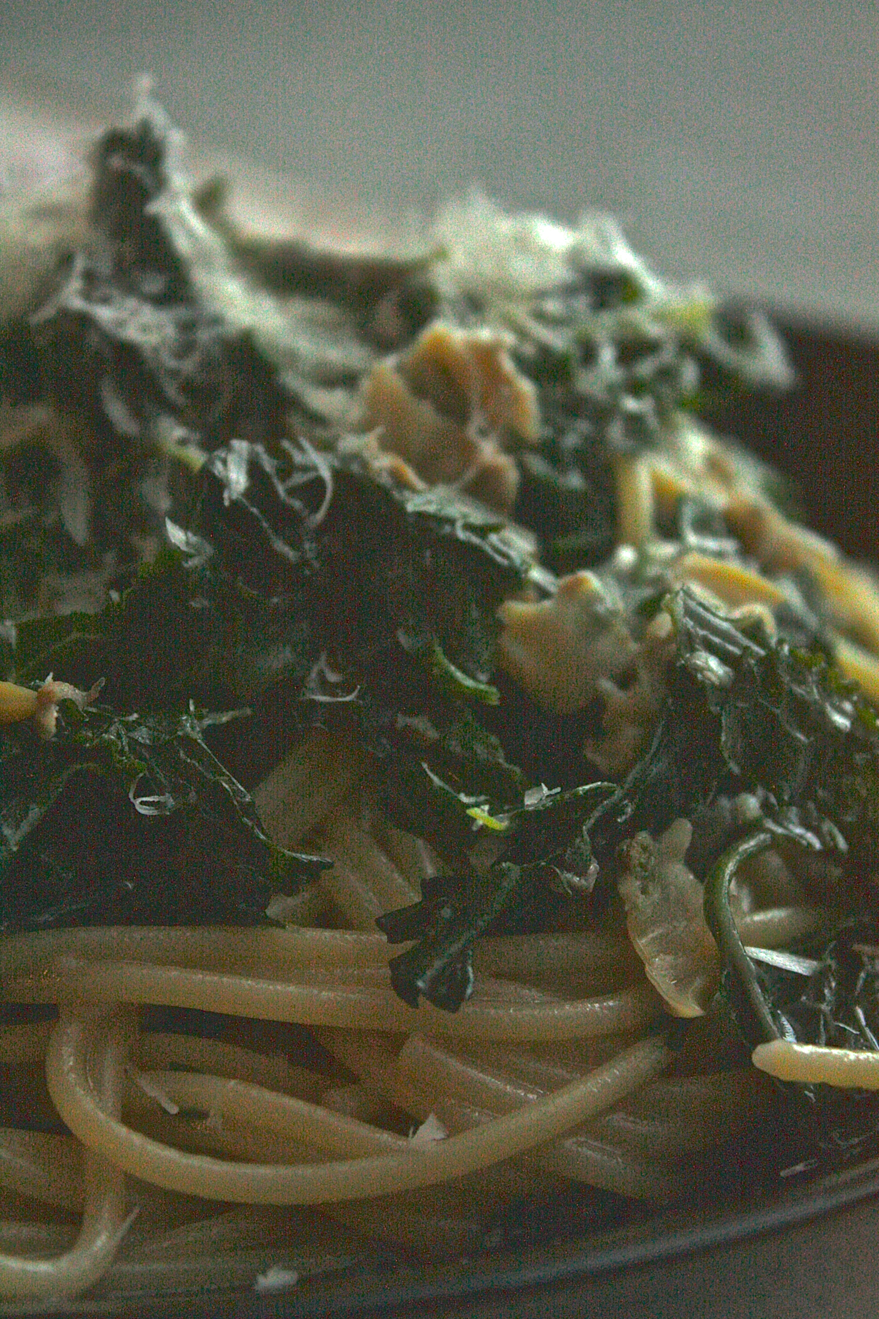 I’m always trying to work more green vegetables into meals and one day when I was picking up supplies for Clam Linguine, I thought about how it’s the only time I like to use lots of parsley in a dish. Realizing that it was because the parsley absorbed all the other flavours, I wondered if kale wouldn’t just do the same thing. By quickly blanching the kale in the pasta water before adding it to the pan and reducing the amount of pasta, it added lots of vitamins and nutrients without taking anything away from a beloved dish.