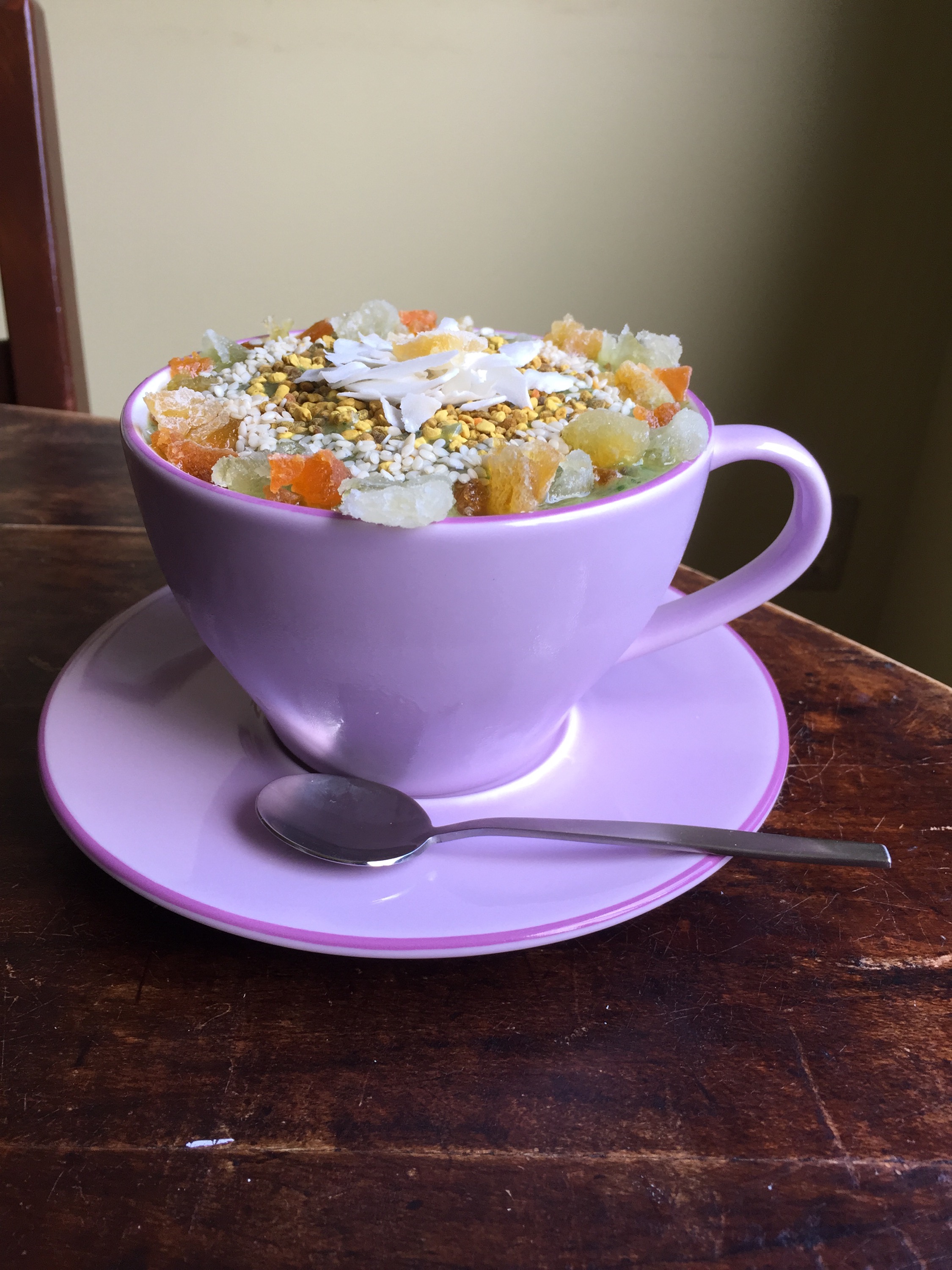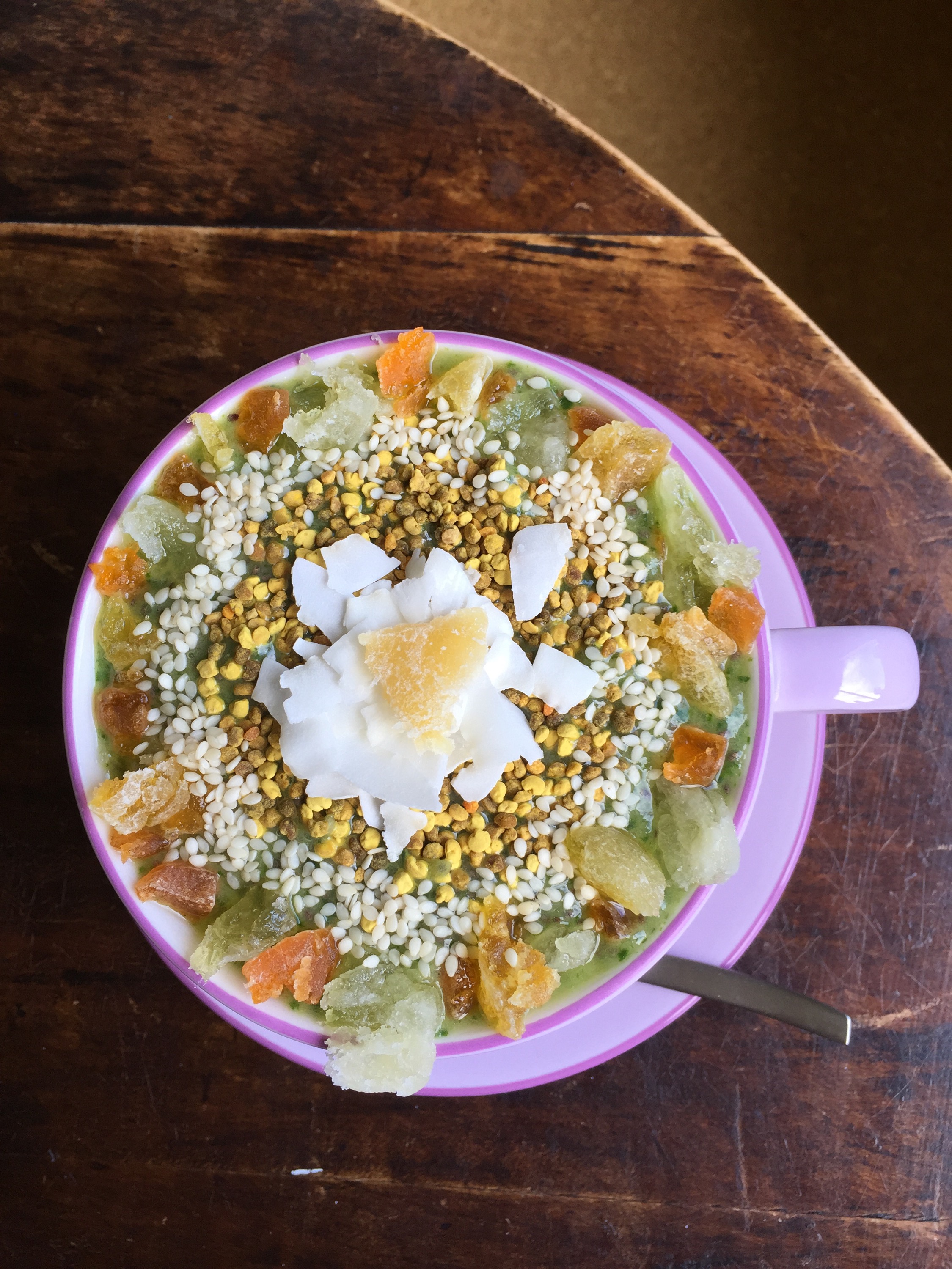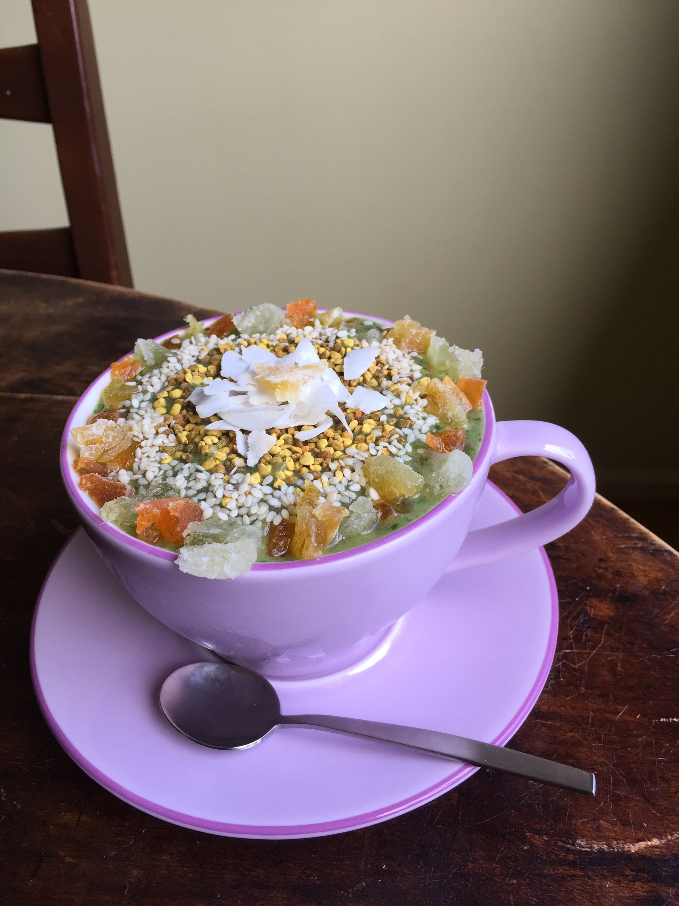 Dish your favourite smoothie blend into a bowl (or in this case, an oversize teacup) then add fresh and/or dried fruit, nuts, seeds, bee pollen, granola or whatever grabs your fancy to add some taste and texture. Bonus points are awarded for creating an eye pleasing arrangement!