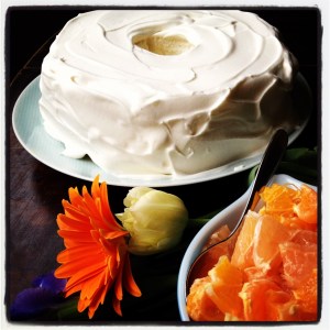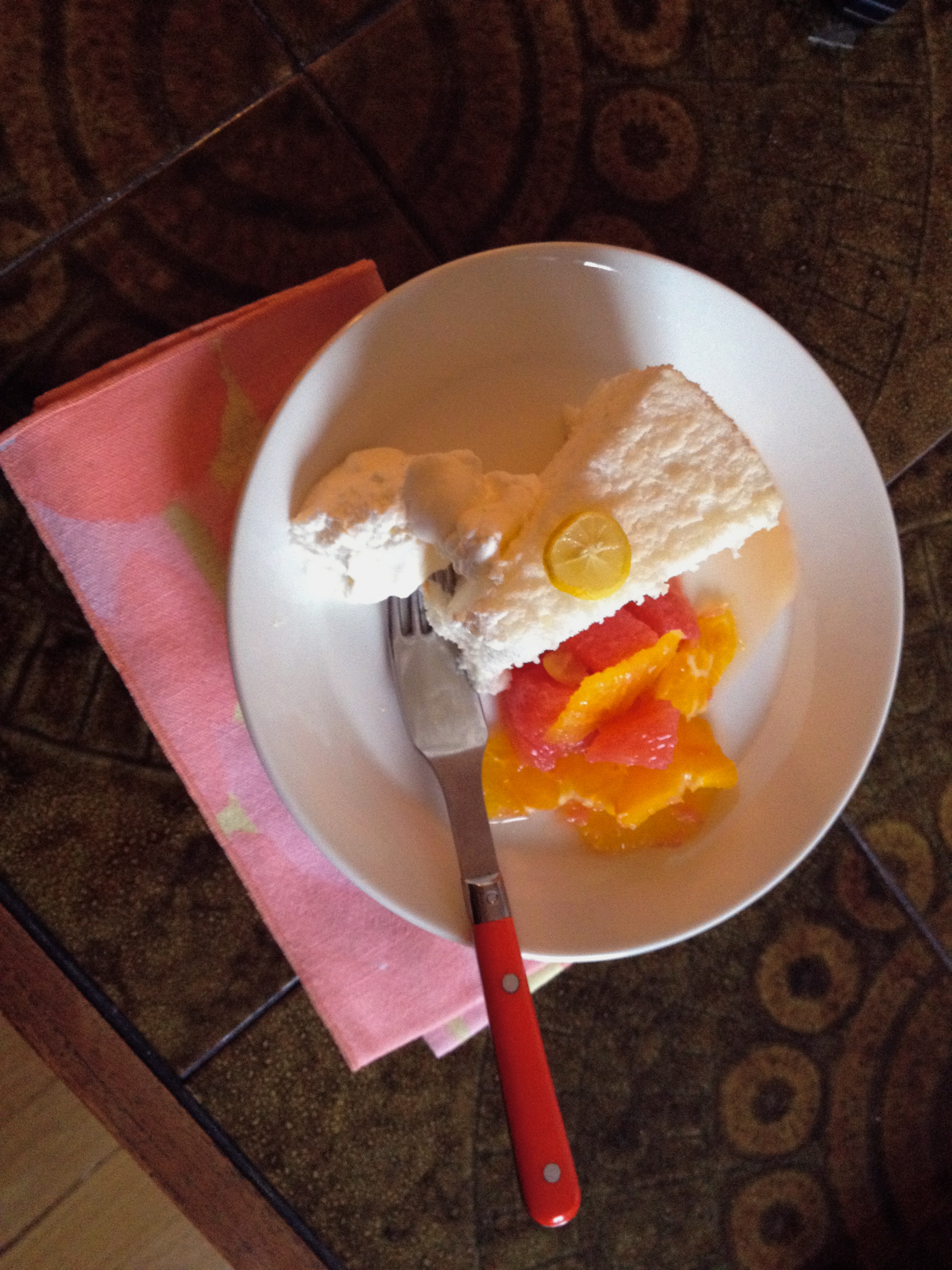 I admit that I was a bit nervous when I gently cut into the cake with a serrated knife. Would it be mushy in the middle? Overly dry? No. It was heavenly. I finally understood that Angel Food Cake is just a moist meringue given structure by the flour. The vanilla, lemon and almond came together in a celestial harmony that had me savouring every bite. The slightly sweetened whipped cream and the brightly flavoured citrus salad made each forkful an enjoyable combination of texture and tastes. The cake was a hit! Watching some of my favourite people on this planet enjoying my very first Angel Food Cake made my heart soar high above the clouds.